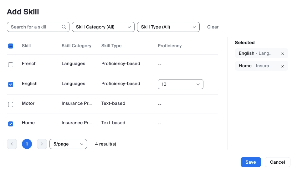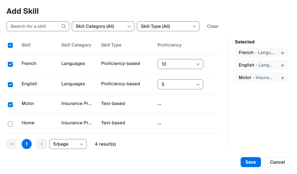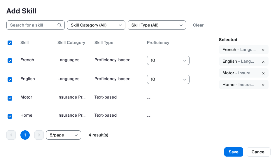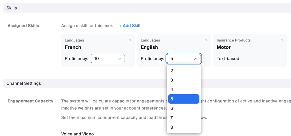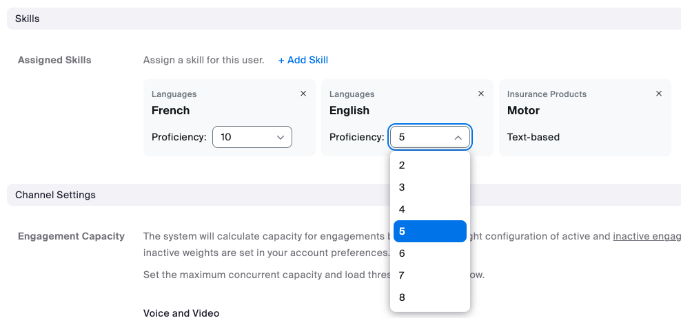 Skills are agent traits that indicate that they are the right person to handle a customer interaction. Proficiency ratings correspond to the agent’s level of expertise or knowledge of that skill. Skills are assigned to agents' profiles to define which skills they possess and, optionally, their proficiency in that particular set of skills. A higher proficiency rating means an agent is better at that skill.