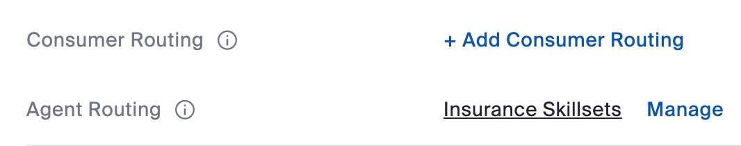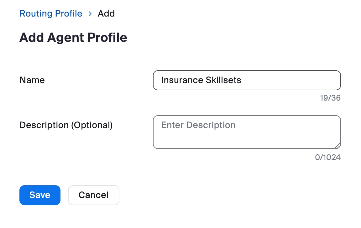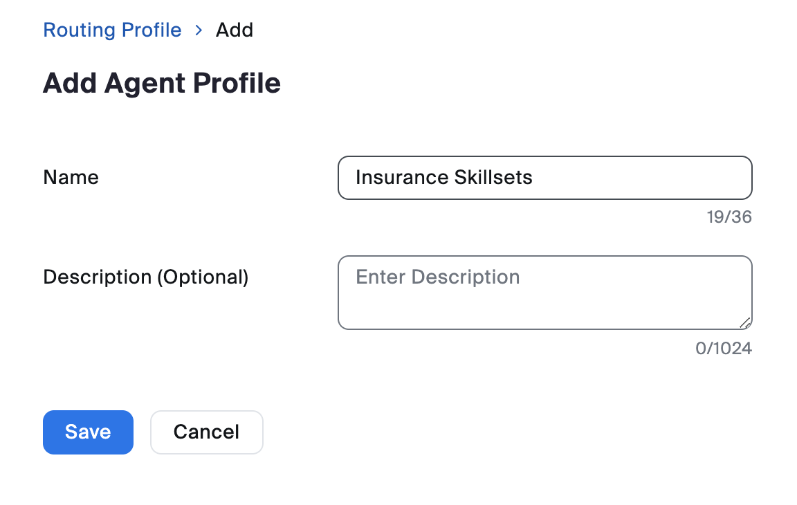 A new Agent Routing Profile by navigating to Contact Center Management > Routing Profiles. Once the Agent tab is selected Admins will be able to select the Add Agent Profile button. The Agent Routing Profile should be given a meaningful name (e.g. Insurance Skillsets).