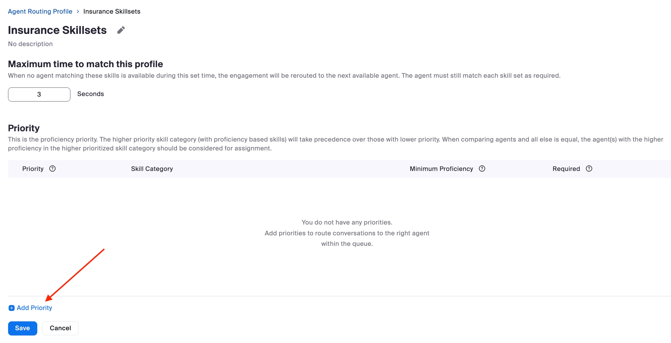 In the next screen the Admin will be presented with a blank Agent Routing Profile that should be populated. At the bottom of the Priority table the Add Priority button should be selected twice to add two new entries into the Priority table.