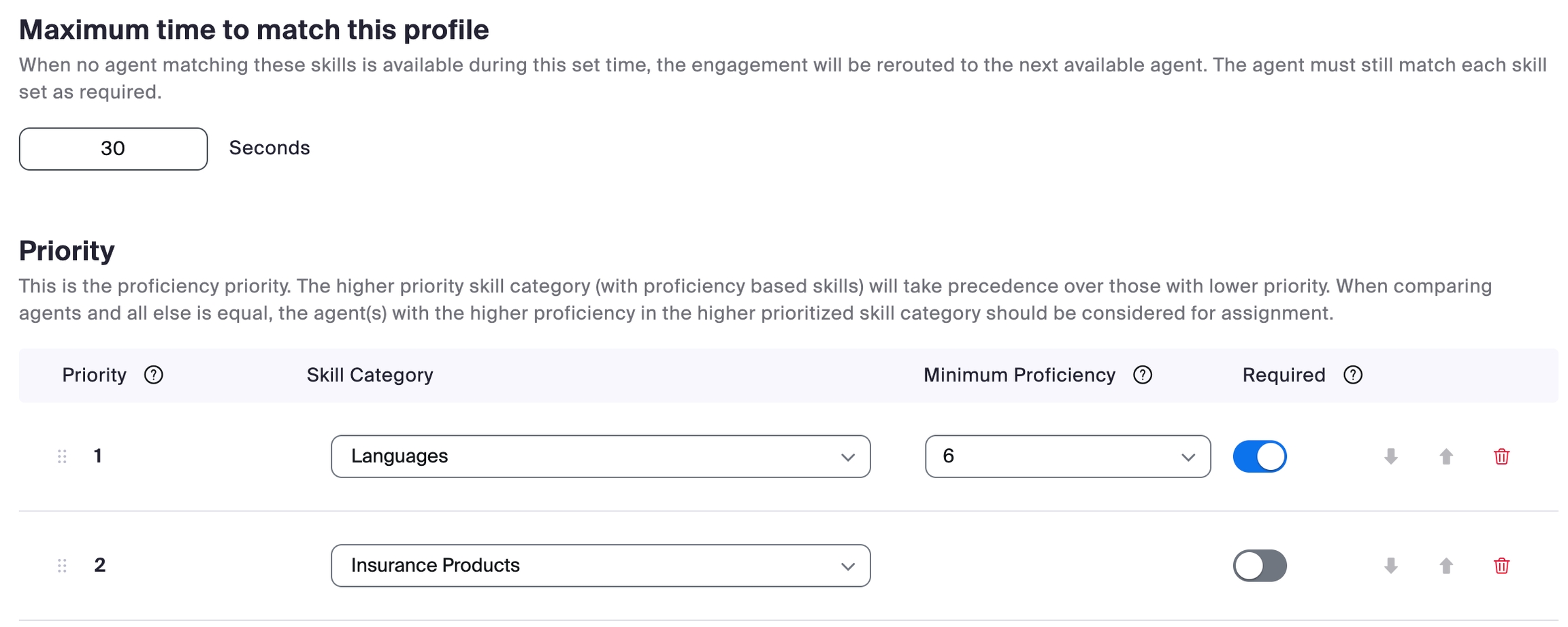 In the Maximum time to match this profile setting we will enter 30 seconds. If the Admin has set a Skill Category to 'Required', keep in mind that engagements may be placed in queue even if agents are available. This could happen because the available agents do not have the 'Required' skill assigned to them and therefore are not eligible to receive the engagement.
