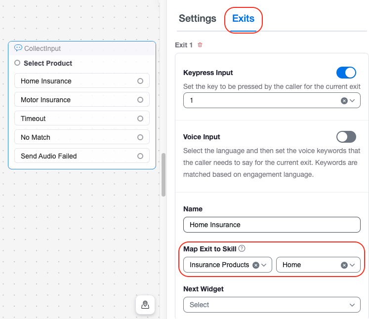 In this example, there are two Collect Input widgets; one for the consumer's language selection and a second one for their product selection. An example from the Select Product widget is shown below. The Admin should map a Skill Category & Skill to each of the exits.