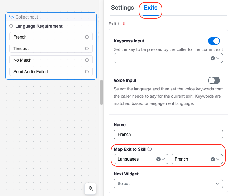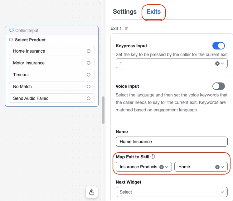 Collect Input widgets map a skill requirement to consumer input (digit input in an IVR menu, for example).