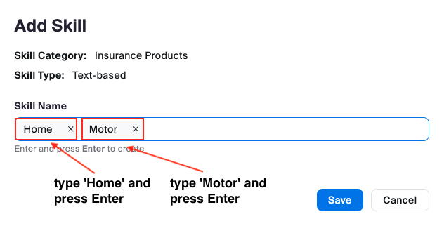 Once the Admin has clicked the Save and Add Skills button they will be able to populate the appropriate skills in the Skill Name field. This fictitious insurance company deals with queries related to home and motor insurance.