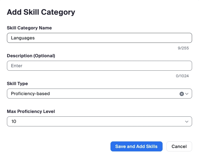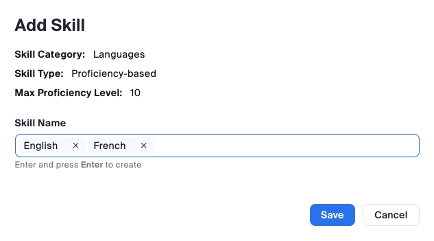 Once the changes have been saved, the Admin will need to repeat the process to add the Language skills, this time choosing Proficiency Based as the Skill Type.