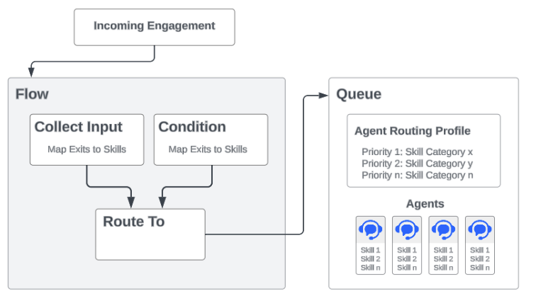 Before the consumer is sent to a queue to be answered by an agent, the flow has the ability to identify what the consumer needs and the necessary skills required of the agent who ultimately answers the engagement.