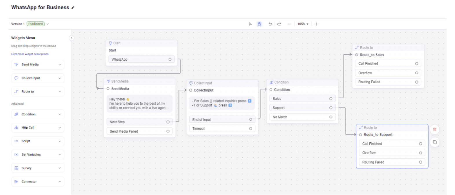 In this example, both Route To widgets are actually routed to the same queue, but in a real-life scenario, each route should have a different destination.