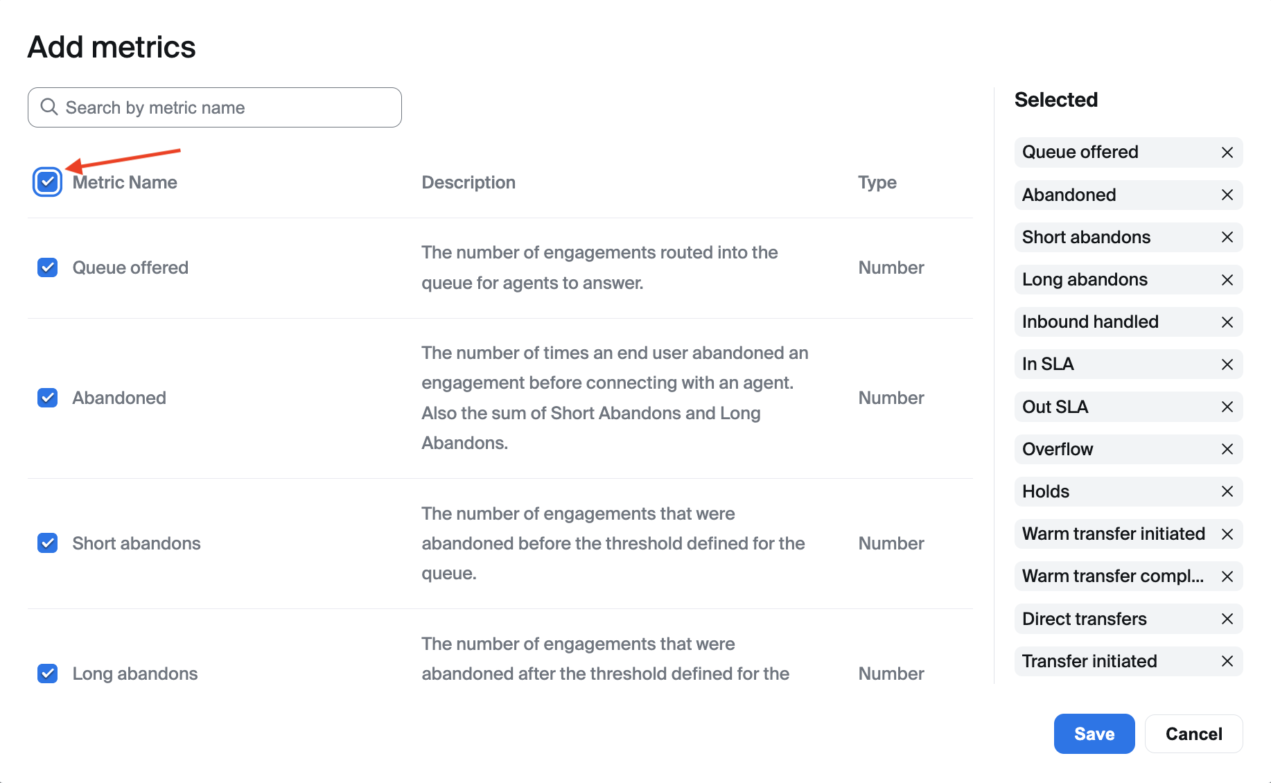 The dataset you select will dictate which reporting data and metrics are available in your report. Select a dataset according to the type of report you'd like to run. For example, if you would like to create a report which focused on inbound traffic into your queues, then select the Queue Inbound dataset.