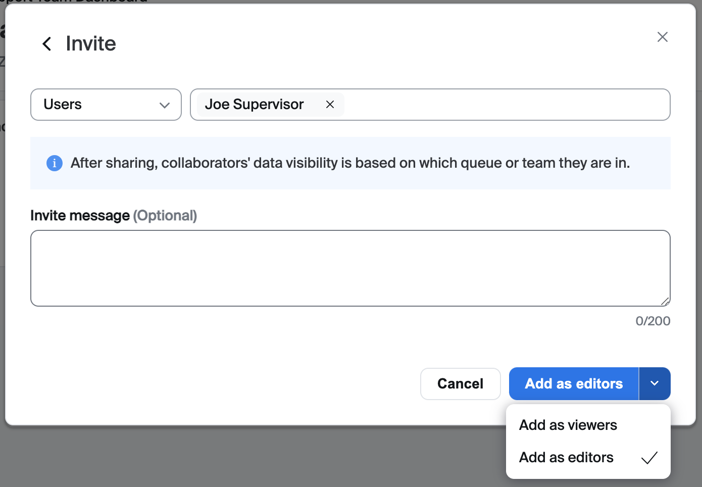 4. Use the drop-down on the top left-hand side to select whether you'd like to add users, teams or queues to the list of collaborators, then use the search field on the right to search for associated contact center entities. Make a selection from your search results.\