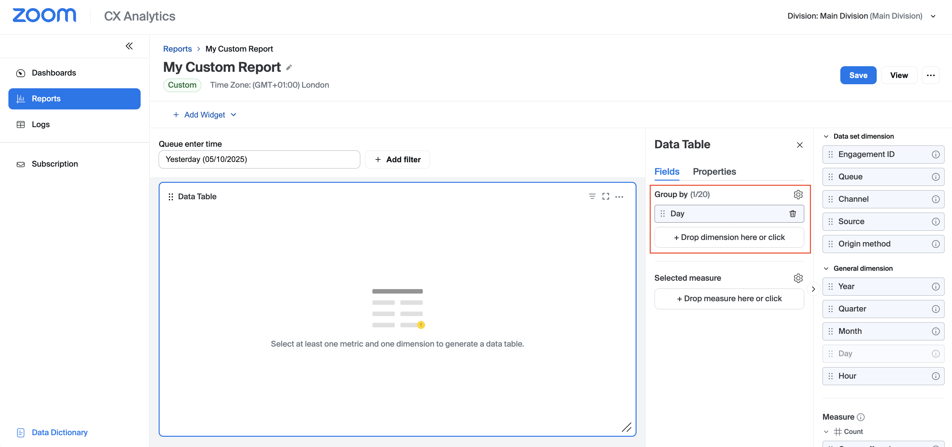 8. Scroll down to the **General dimension** section, then drag and drop the **Day** dimension into the **Group by** section.\