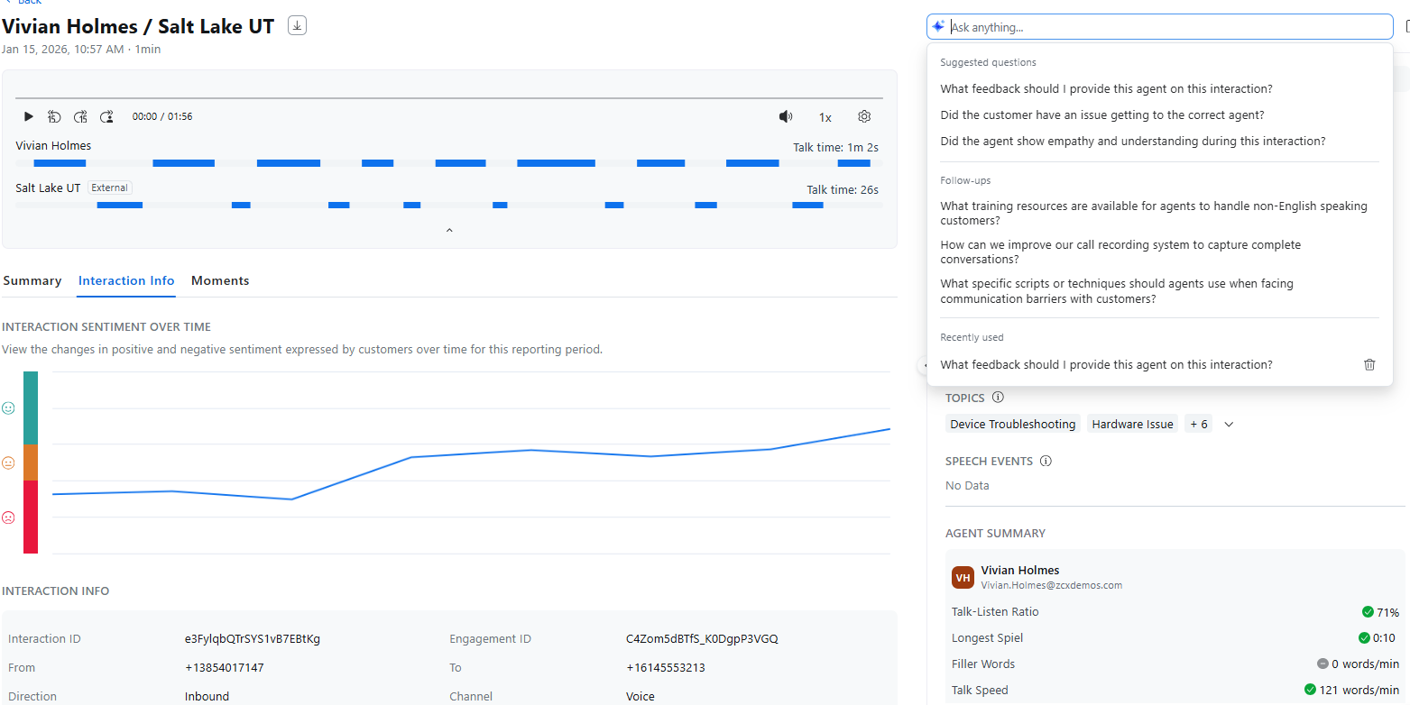 On the **Interactions** sub-menu, click the blue **Interaction ID** in any row to open a detailed view of that interaction. From there, users can play the recording, read the transcript, and view the associated analytics, comments, and details. After selecting an **Interaction ID**, Quality Management's conversational analysis is displayed on-screen.