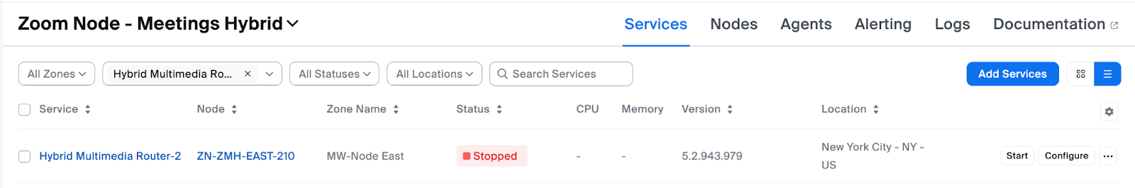 1. Choisissez le serveur Zoom Node où vous venez de déployer le service Hybrid ZC Proxy.