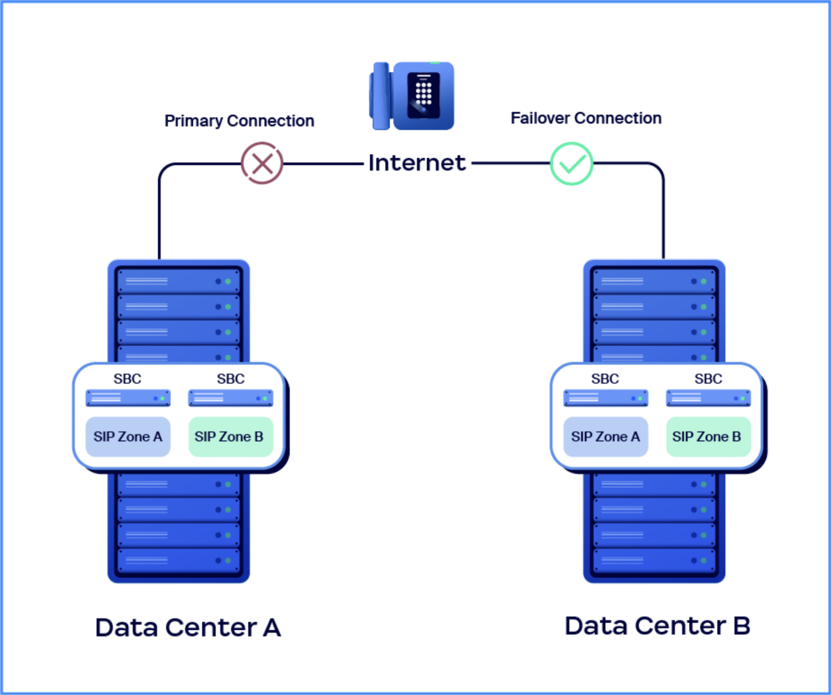 In un'architettura active-active, resilienza e ridondanza sono fondamentali. Per supportare il canale vocale e le esigenze di telefonia, ogni data center di Zoom Contact Center dispone di due zone SIP identiche e interconnesse dotate di hardware e servizi dedicati per resilienza e sostenibilità indipendenti.