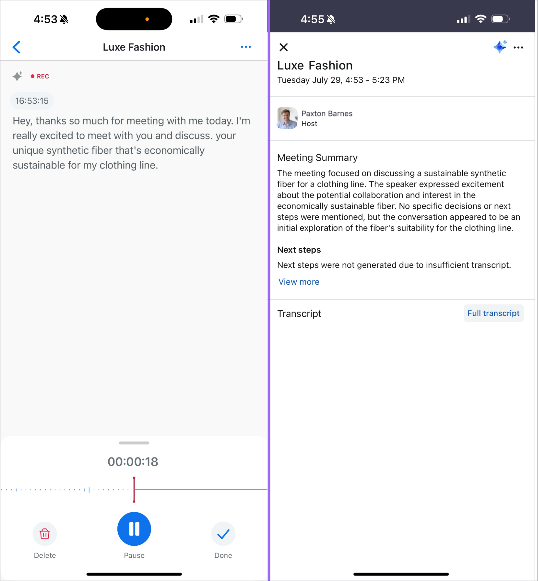 La funzione di registrazione vocale porta la potenza di AI Companion nelle conversazioni di persona, permettendo agli utenti di catturare, trascrivere e riassumere discussioni dal vivo direttamente all'interno dell'app mobile Zoom Workplace. Ideale per formazione in loco o per un incontro faccia a faccia con un cliente, gli utenti possono registrare audio di alta qualità e generare automaticamente trascrizioni e sommari AI simili a quelli prodotti per riunioni e chiamate telefoniche.