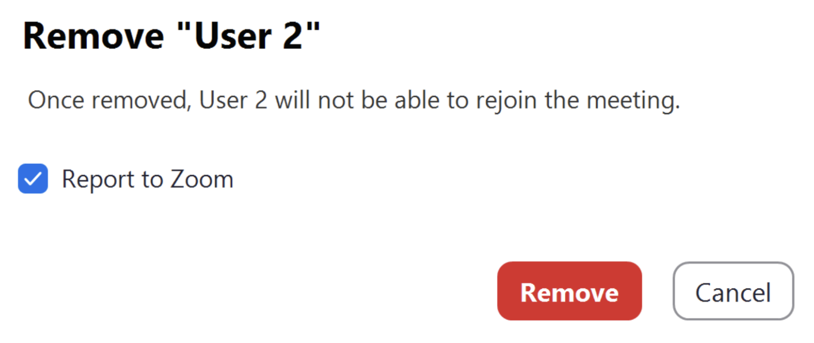 Questo può essere fatto facendo clic sull' **Sicurezza** icona nella finestra della riunione Zoom e poi facendo clic su **Rimuovi partecipante**. Puoi quindi selezionare il partecipante da rimuovere dalla riunione. Puoi anche segnalare l'utente al team Trust & Safety di Zoom. Il partecipante rimosso non può rientrare nella riunione.
