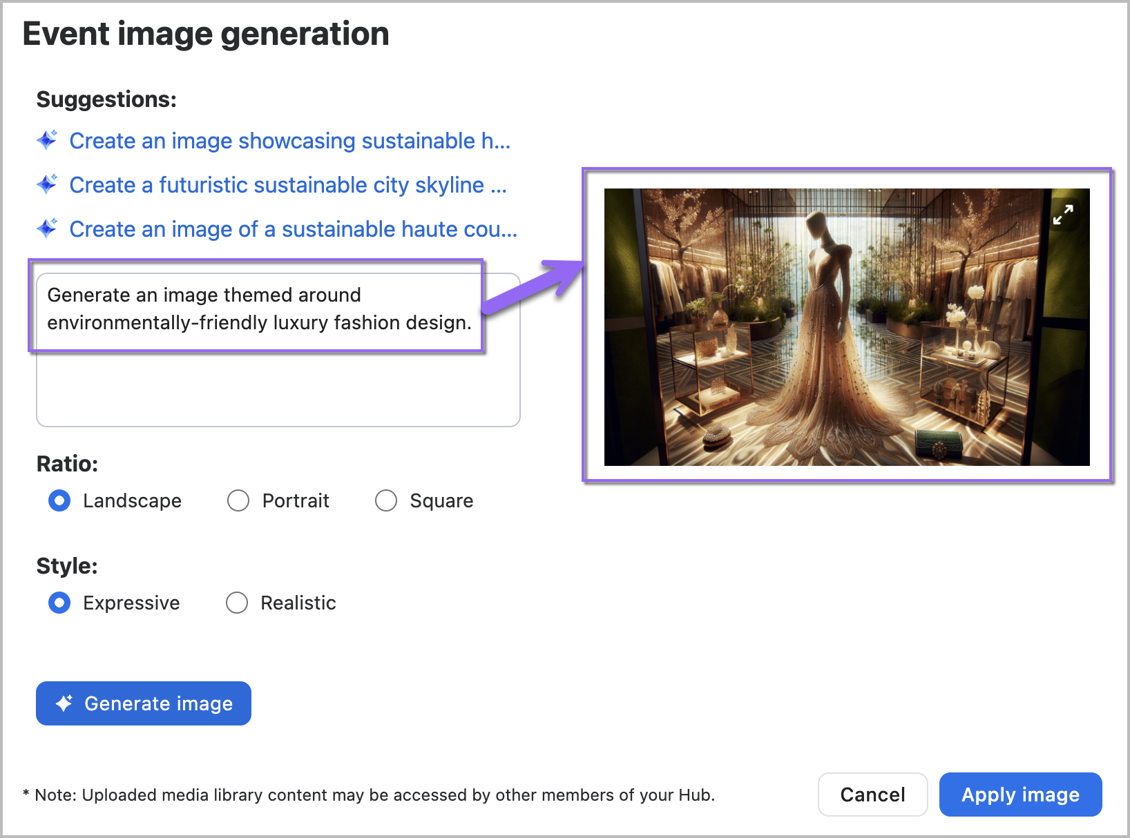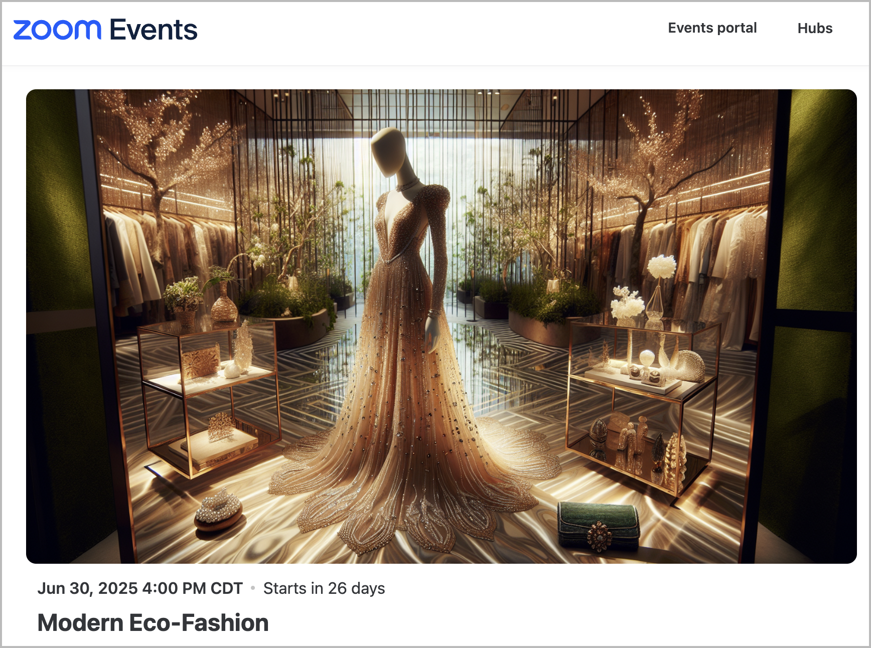 O recurso de Geração de Imagens do Zoom Events permite que os organizadores criem imagens personalizadas para seus eventos usando IA. Isso inclui gerar imagens para cabeçalhos de eventos, imagens de sessões, imagens de exposições e mais. Os usuários podem inserir prompts específicos, escolher entre estilos sugeridos pela IA e definir proporções de imagem (paisagem, retrato, quadrado). Uma vez geradas, as imagens podem ser pré-visualizadas e aplicadas diretamente ao evento, realçando o apelo visual do evento sem a necessidade de ferramentas de design externas.
