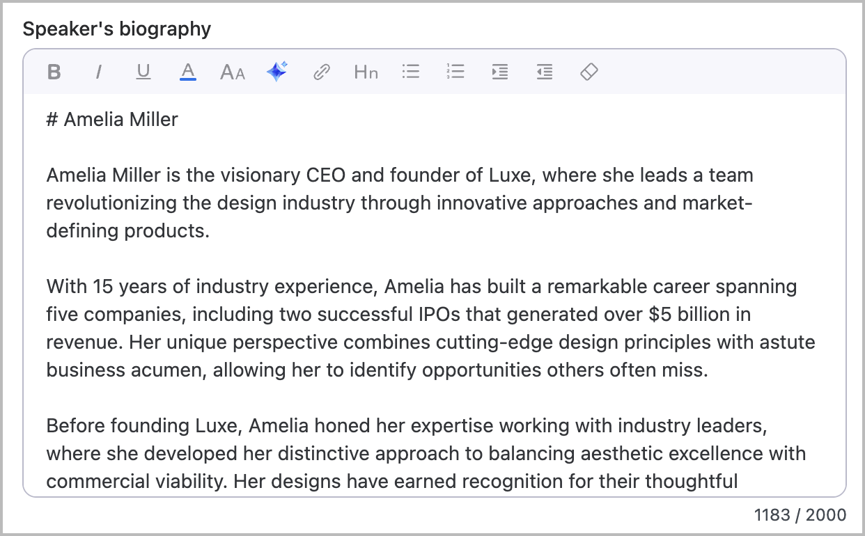 O recurso Composição de Eventos ajuda os usuários a gerar rapidamente conteúdo para áreas relacionadas a eventos, incluindo descrições, detalhes de sessões, biografias de palestrantes e anúncios no saguão. Ao fornecer contexto ou um prompt, os usuários podem receber sugestões de texto geradas por IA que correspondam ao seu estilo e tom.