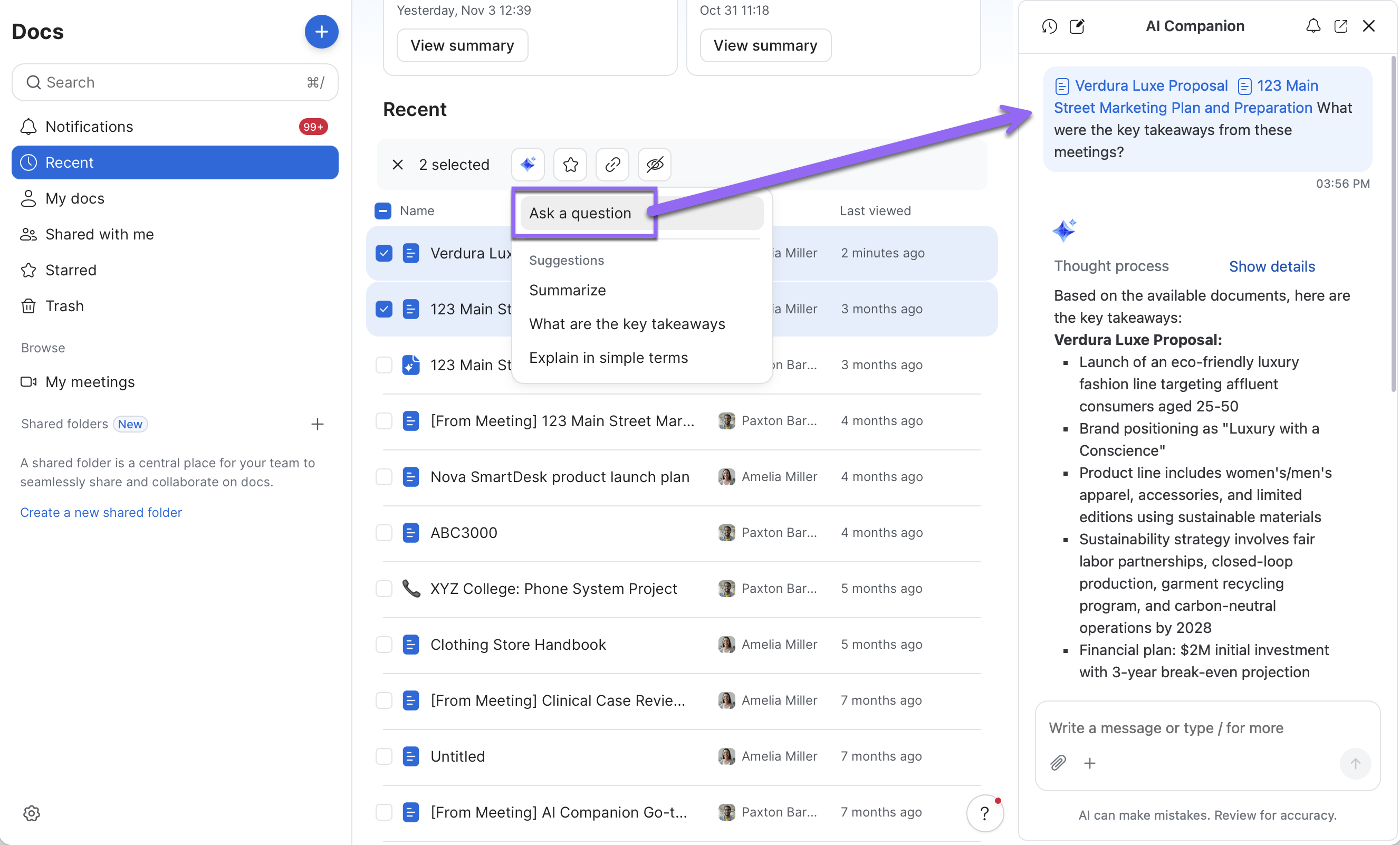Ao habilitar a interação direta de perguntas e respostas com o conteúdo armazenado, esse recurso ajuda os usuários a localizar detalhes-chave e trazer informações relevantes mais rapidamente — reduzindo a necessidade de revisar manualmente arquivos inteiros.