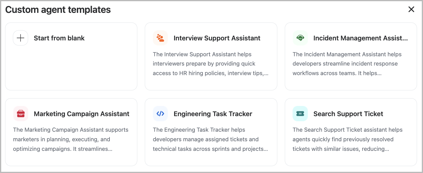 Ao criar um Agente Personalizado, os administradores podem Selecionar de uma lista predefinida de modelos ou começar com uma configuração em branco. Os modelos oferecem uma maneira rápida de lançar uma configuração pronta para uso, alinhada a funções ou fluxos de trabalho comuns, ajudando as organizações a expandir rapidamente os recursos de IA sem começar do zero.