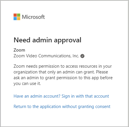 När du testar konfigurationer för kalenderintegrering kan användare stöta på ett Microsoft 365-godkännande fel som anger att integreringen kräver administratörsgodkännande. Detta kan inträffa om användarsamtyckesbehörigheter mellan Azure och Zoom Workplace inte stämmer överens, eller om en användare har en sessionscookie från en tidigare autentisering före applikationsgodkännande.
