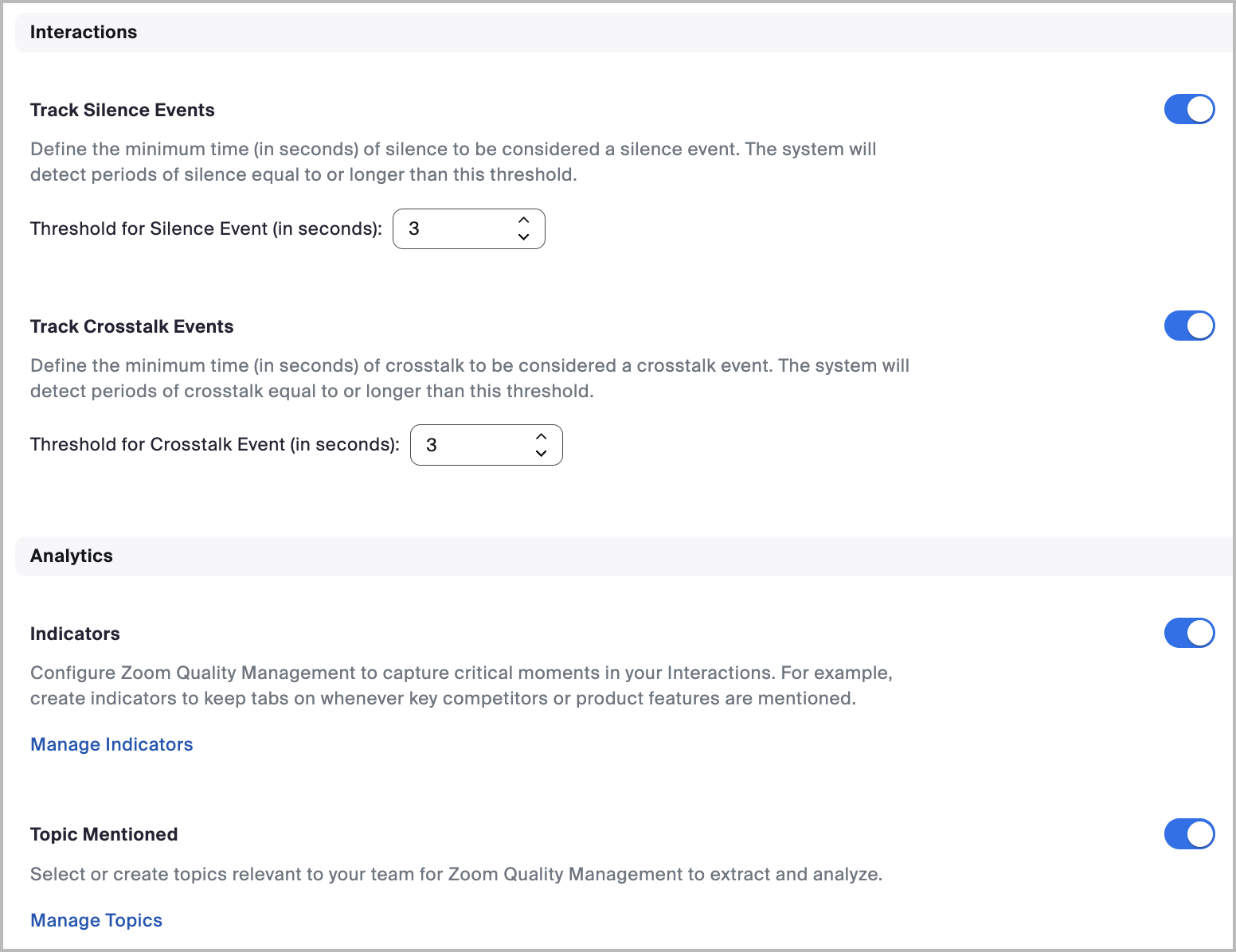 Kvalitetshantering kräver åtkomst till ett kontos Zoom Contact Center-inspelningar och transkriptioner för att generera insikter och analyser, och måste aktiveras i Zooms webbportal av en kontoadministratör eller auktoriserad användare.