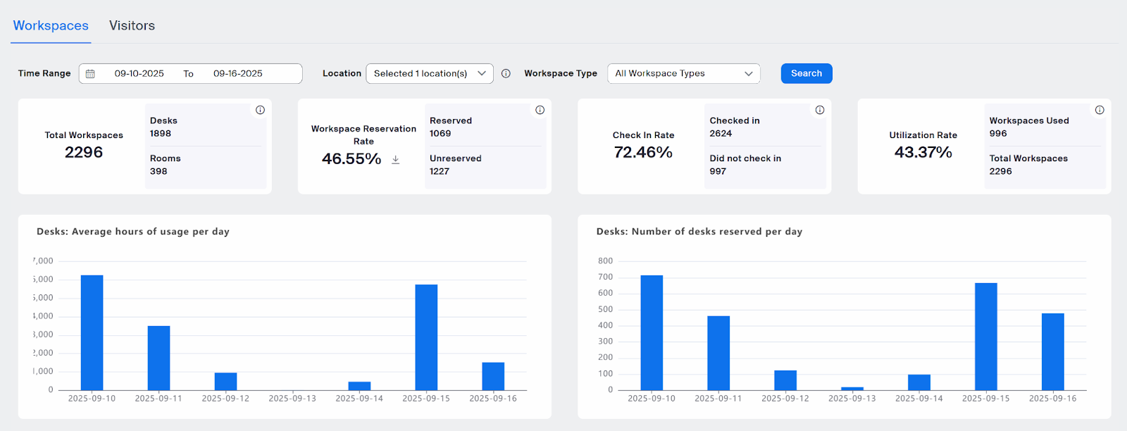 Administratörer och auktoriserade användare kan se Workspace Reservation-mått, rapporter och analyser i kontrollpanelen. Dessa data inkluderar totala reservationer, användning och incheckningsfrekvenser, enkätresultat med mera.
