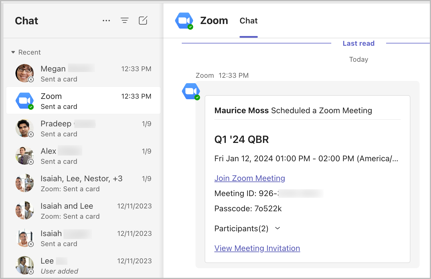 * تتم دعوتهم إلى اجتماع Zoom داخل دردشة أو قناة في Teams.