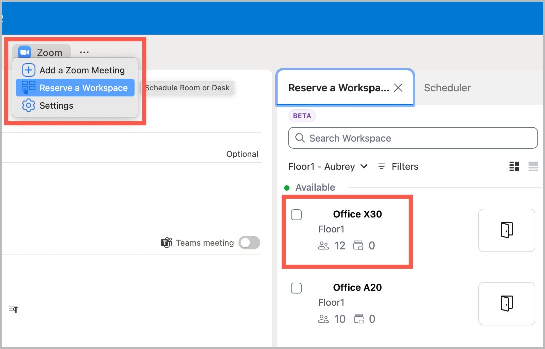 تم دمج Zoom Workspace Reservation في إضافة Zoom for Outlook لتبسيط عملية حجز غرف الاجتماعات والمكاتب أثناء إنشاء أحداث التقويم في Outlook. وهذا متاح بشكل حصري للمستخدمين الذين ينتمون إلى حساب Zoom لديهم اشتراك Workspace Reservation. يمكنك حجز مساحة غير تابعة لـ Zoom، مثل مكتب أو غرفة حجز، من خلال الإضافة باستخدام Workspace Reservation. ومع ذلك، يجب أن تكون المساحة مرتبطةً بتقويم Microsoft 365.