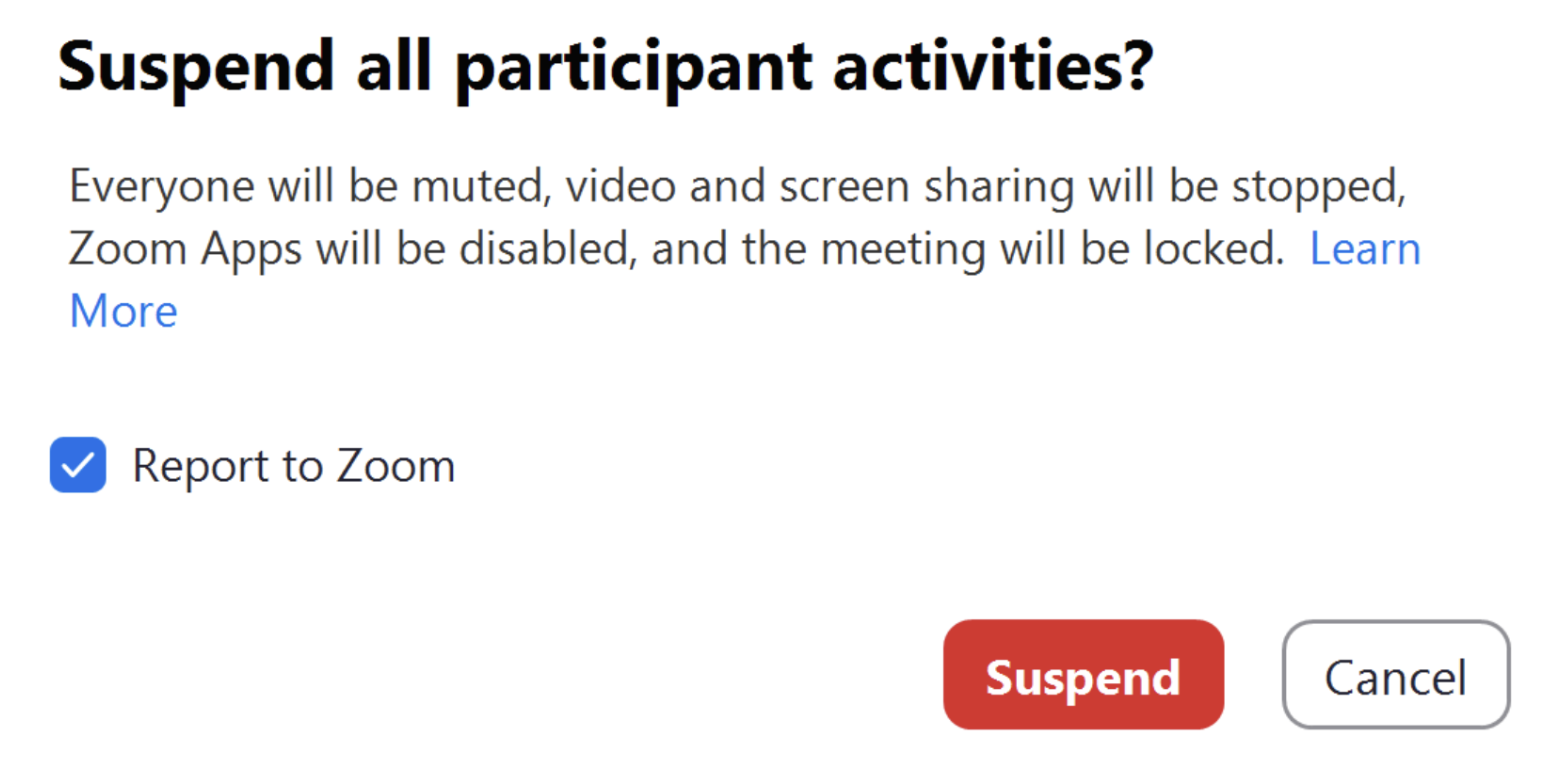 أثناء اجتماعك، انقر على **الأمان** الأيقونة وحدد **تعليق أنشطة المشارك** لإيقاف كل فيديو وصوت ومشاركة شاشة أو السبورة البيضاء داخل الاجتماع مؤقتًا، والدردشة، والوصول إلى الملفات المشتركة في الاجتماع، والتسجيل، وإغلاق أي غرف فرعية نشطة. يمنحك هذا التنبيه خيار الإبلاغ عن المشكلة إلى فريق الثقة والأمان في Zoom وتأكيد اختيارك لتعليق النشاط.