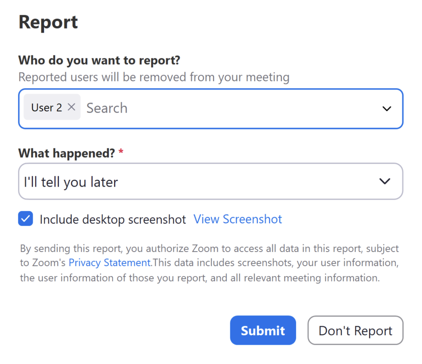 يمكنك تضمين لقطة شاشة إذا لزم الأمر واستخدام القائمة المنسدلة لتقديم سبب الإبلاغ عن المشارك. يتم إرسال هذا البلاغ تلقائيًا إلى فريق الثقة والأمان في Zoom، والذي سيحدد ما إذا كان قد حدث أي إساءة استخدام للمنصة وسيحظر المستخدم إذا لزم الأمر. ستتم إزالة المستخدم (المستخدمين) من اجتماعك بمجرد تقديم البلاغ.