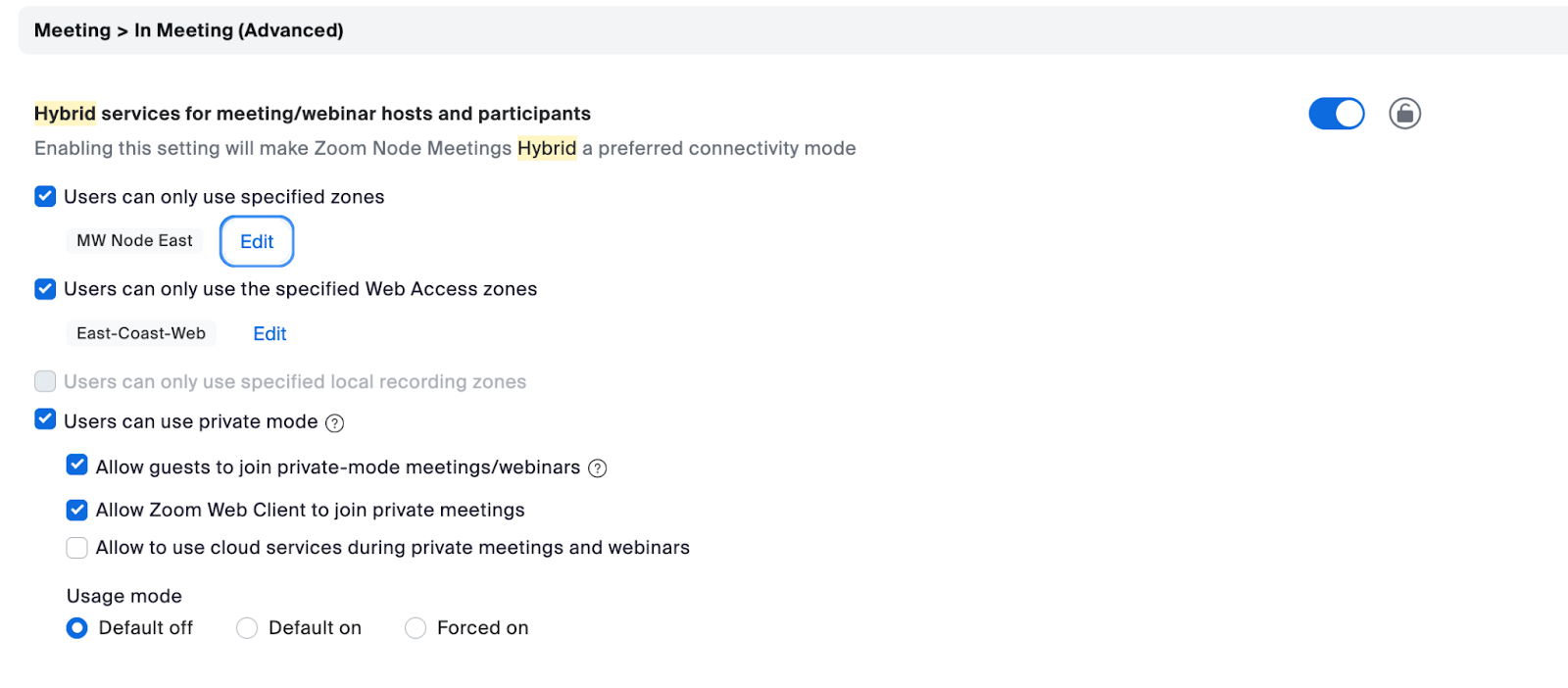 Zoom yönetici portalına dönün ve şuraya gidin: **hesap Yönetimi > hesap Ayarlar > toplantı (Gelişmiş)** ve aşağı kaydırın **toplantı ev sahipleri ve Katılımcılar için hibrit hizmetleri kullan seçeneği**.