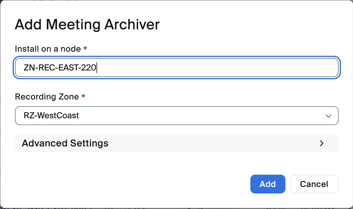 7. Tıklayın **Gelişmiş Ayarlar** toplantı Archiver hizmeti için ek Ayarlar Yapılandırmak için:
