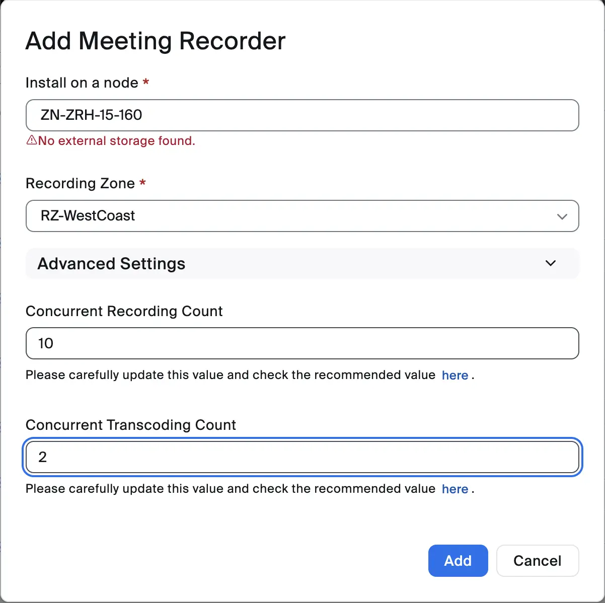 Eşzamanlı kayıtların maksimum sayısı,[ Node sunucusunun donanımına dayalı önerilen maksimum değeri aşmamalıdır](https://support.zoom.com/hc/en/article?id=zm_kb\&sysparm_article=KB0060770).