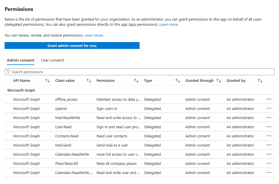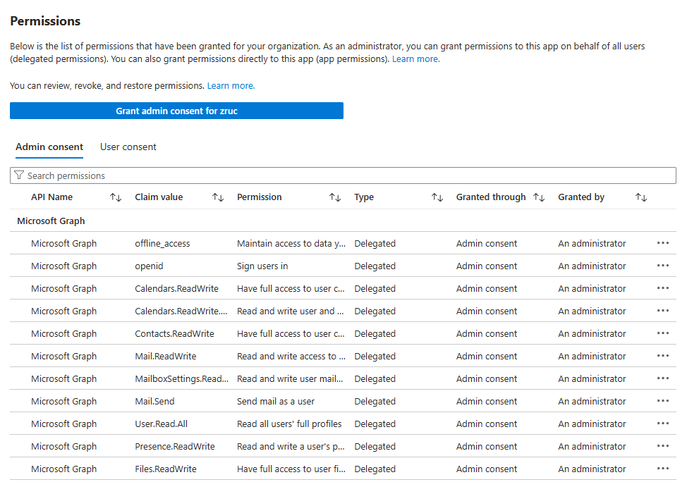 Yukarıdaki doğrulama adımlarında açıklanan aynı yöntemleri kullanarak, **kaldırabilirsiniz** gerekirse Zoom uygulamaları için izinleri. Zoom hizmetlerini Microsoft 365 ile entegre etmenin Uygulama İzinleri yönteminin kuruluşunuzun rahat olduğu seviyeden daha yüksek bir izin düzeyi sağlayabileceği, Takvim ve Kişi kullanıcı onayı ayarlarını Zoom web portalında yapılandırma bölümünde belirtildiği gibi.