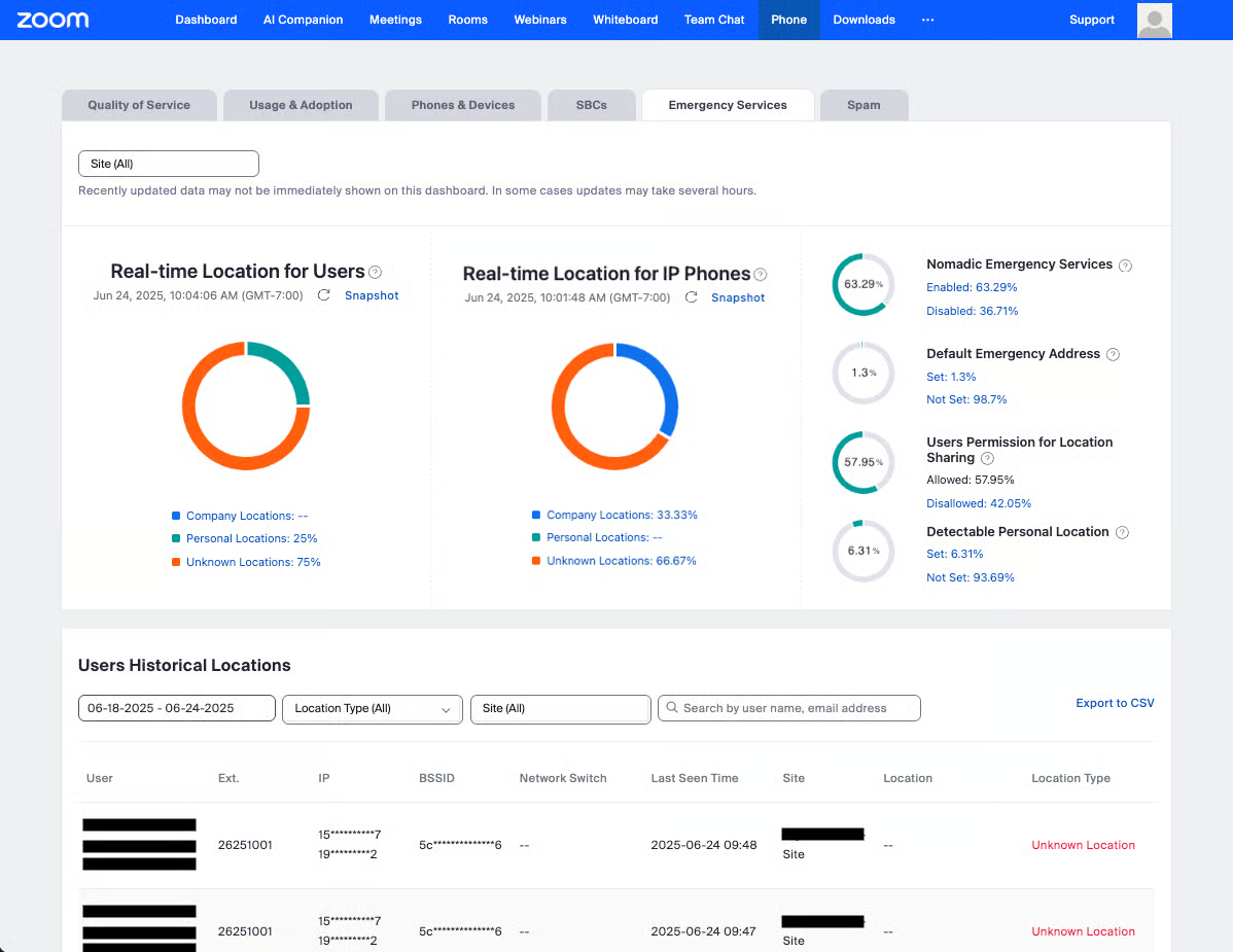 Organizasyonunuzun acil çağrı hazırlığını nasıl yönettiğini takip etmek kritik öneme sahiptir—özellikle kullanıcılar birden fazla Konumda çalışırken. Zoom Phone Acil Durum Hizmetleri Pano, yöneticilerin kullanıcıların ve cihazların acil durum Konum takibini desteklemeye ne kadar hazır olduğunu değerlendirmesine yardımcı olur. İster kimlerin Konum paylaşımına katıldığını inceleyin, ister gezici hizmetleri yönetin ve adres doğruluğunu gözden geçirin, bu Pano Zoom Phone dağıtımınız genelinde uyumluluk sağlamak için size araçlar sunar.