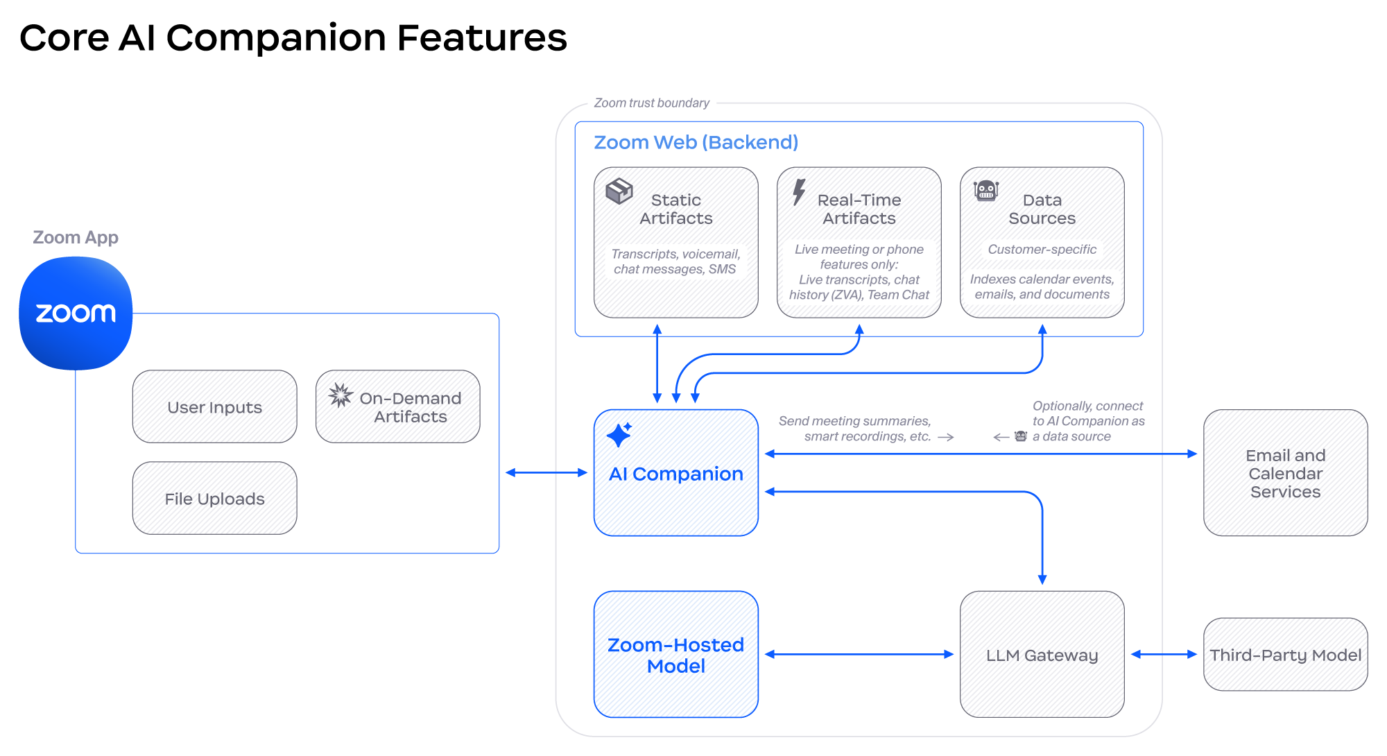 Sơ đồ sau minh họa các luồng dữ liệu đằng sau hầu hết các tính năng của Zoom AI Companion, được tổ chức theo các Nguồn nội dung cung cấp đầu vào cho các dịch vụ AI này:
