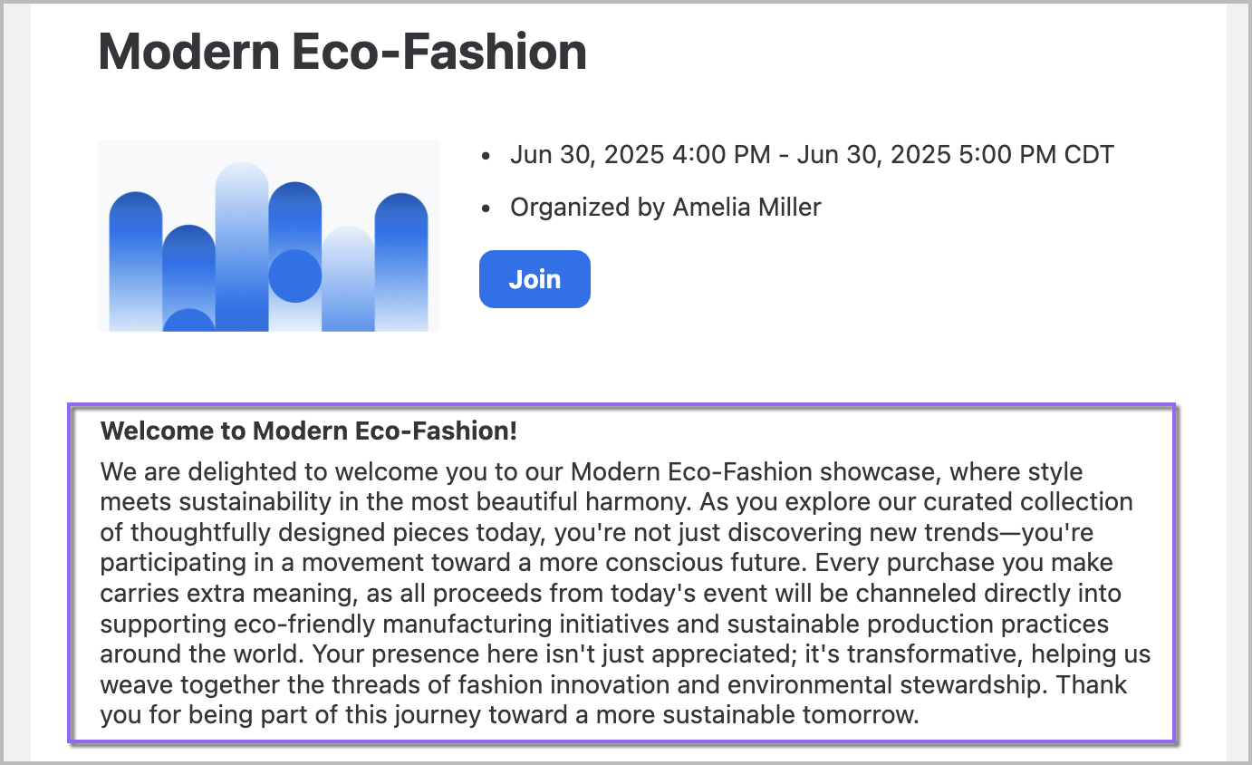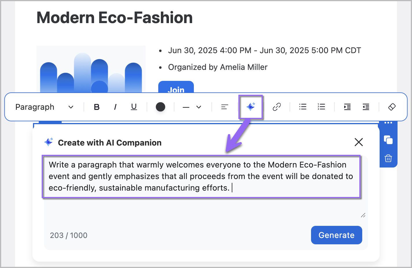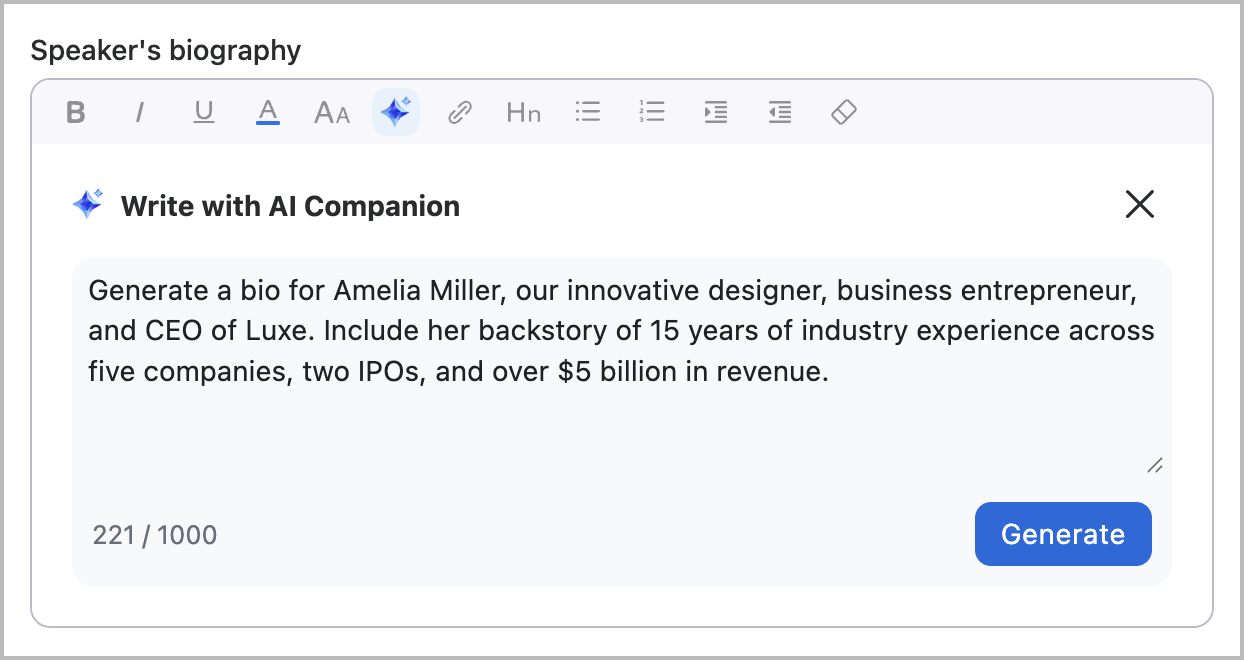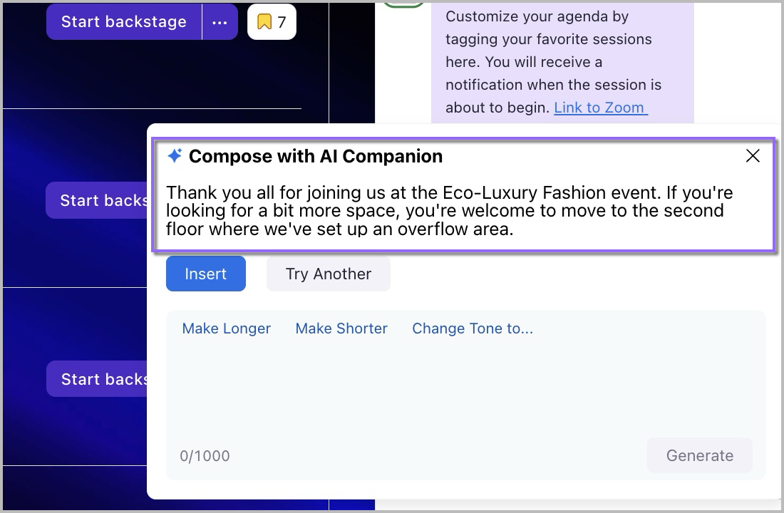 Tính năng Soạn Sự kiện giúp người dùng nhanh chóng tạo nội dung cho các khu vực liên quan đến sự kiện, bao gồm mô tả, chi tiết phiên, tiểu sử diễn giả và thông báo phòng chờ. Bằng cách cung cấp ngữ cảnh hoặc gợi ý, người dùng có thể nhận các gợi ý văn bản do AI tạo ra phù hợp với phong cách và giọng điệu của họ.