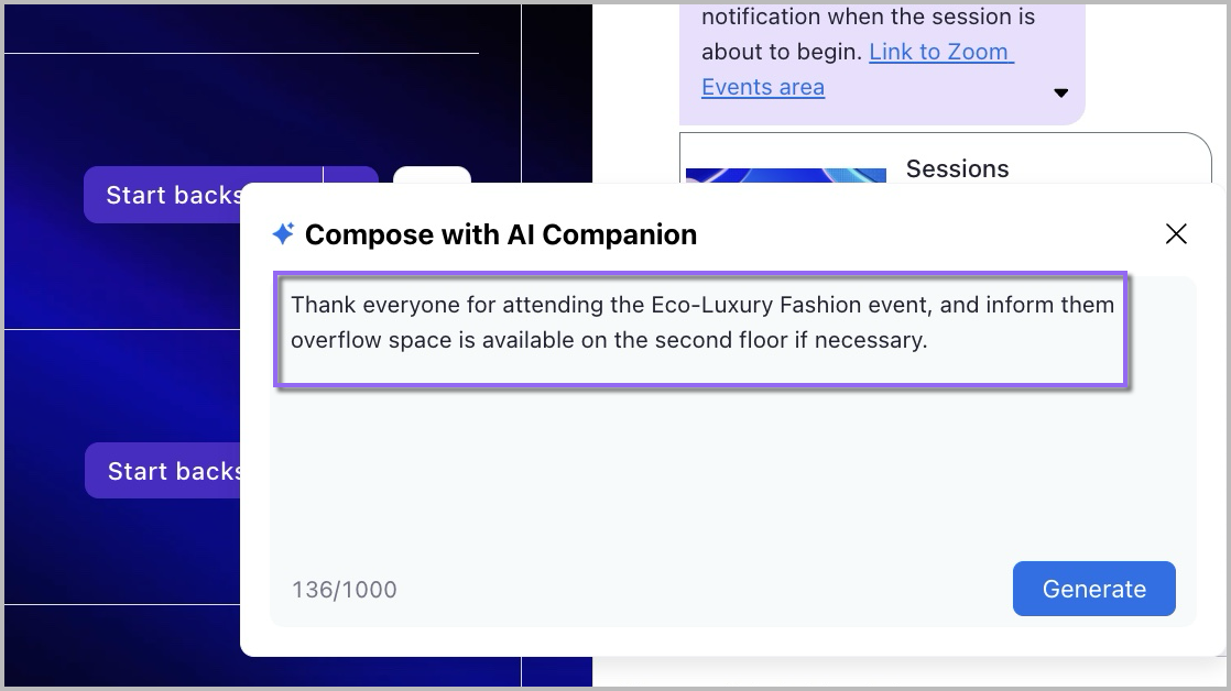 Tham khảo trung tâm hỗ trợ của Zoom để biết thêm thông tin về [Tạo Hình ảnh cho Sự kiện](https://support.zoom.com/hc?id=zm_kb\&sysparm_article=KB0073761) với AI Companion.