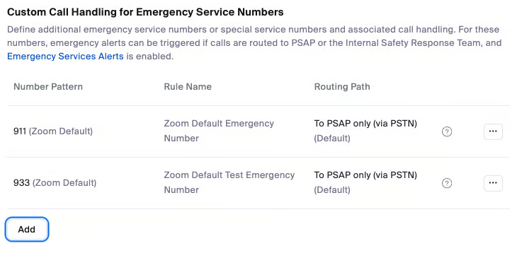 Cuộn xuống **Định tuyến Dịch vụ Khẩn cấp** phần và tìm **Xử lý cuộc gọi tùy chỉnh cho Số dịch vụ khẩn cấp**. Nếu **Xử lý cuộc gọi tùy chỉnh cho Số dịch vụ khẩn cấp** phần không trình bày, hãy mở một yêu cầu Hỗ trợ Zoom để bật dịch vụ cho tài khoản. Khi sẵn sàng, nhấp vào **Thêm** để mở hộp thoại cấu hình.