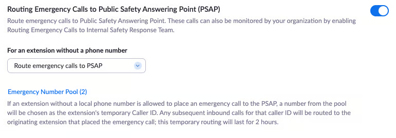 Định tuyến cuộc gọi khẩn cấp có thể được cấu hình ở cấp tài khoản, ở cấp cơ sở trong các triển khai nhiều cơ sở, hoặc ở cấp máy lẻ cá nhân. Các cuộc gọi có thể được định tuyến đến Điểm trả lời an toàn công cộng, đến Nhóm Phản ứng An toàn Nội bộ, hoặc đến cả hai song song. Nhóm Phản ứng An toàn Nội bộ là một hàng đợi cuộc gọi Zoom Phone có thể nhận, ghi và giám sát các cuộc gọi khẩn cấp, và có thể được cấu hình riêng cho từng cơ sở Zoom Phone.