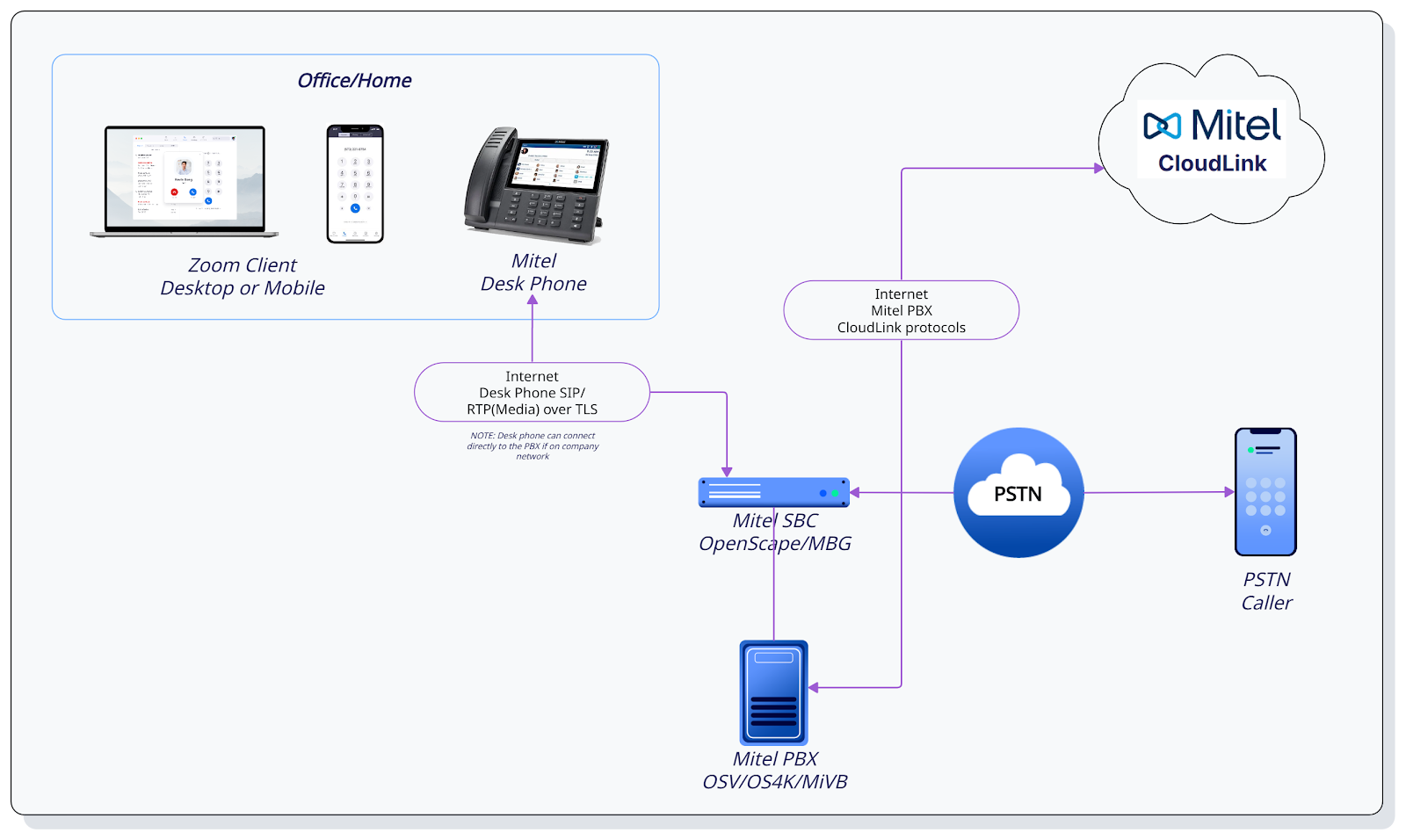 Ý tưởng là: thẻ Zoom Phone của bạn trở thành một softphone SIP (session initiation protocol) Kết nối trực tiếp với nền tảng gọi của Mitel. Nếu bạn đang Kết nối qua internet, nó sẽ sử dụng Trình điều khiển biên phiên OpenScape của Mitel, hoặc SBC. Bạn cũng sẽ sử dụng Mitel CloudLink để giúp việc đăng nhập dễ dàng hơn và quản lý người dùng mượt mà hơn giữa Zoom và Mitel.
