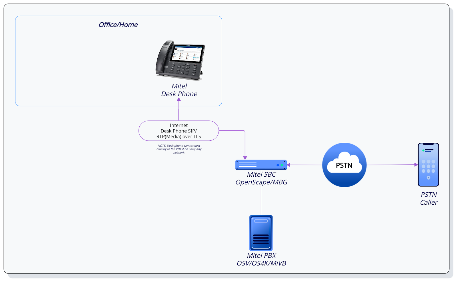 * Thích ứng mạng: Người dùng từ xa kết nối qua CloudLink và Mitel SBC. Máy tính để bàn tại cơ sở kết nối trực tiếp với Tổng đài điện thoại nội bộ Mitel. Thiết bị di động sử dụng tuyến bên ngoài an toàn.