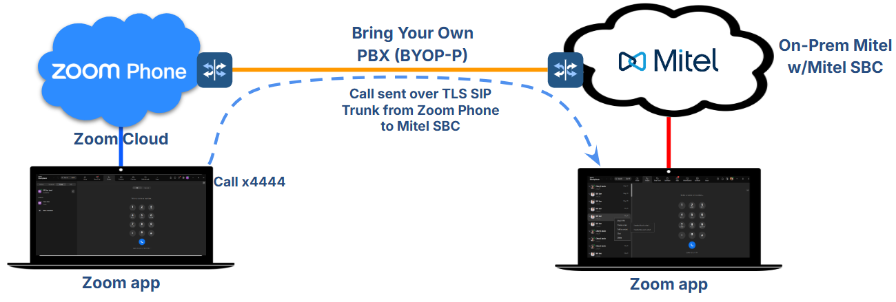 Các tổ chức chạy đồng thời cả Zoom Phone và Thành phần tích hợp Mitel. Người dùng có giấy phép Zoom Phone Kết nối tới Zoom Phone SBC, trong khi người dùng có Thành phần tích hợp Mitel Kết nối tới Mitel SBC. Với một đường trung kế BYOP Kết nối chúng, người dùng có thể quay số máy lẻ giữa các hệ thống khác nhau.