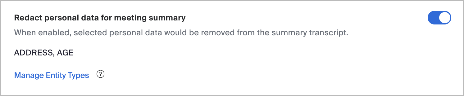 Account admins can redact certain personal data from a meeting summary using Zoom’s pre-defined entity types. Zoom's Personal Data Redaction Service automatically identifies and redacts sensitive personal information within meeting summaries to help maintain privacy and compliance. When applying these settings, these changes are applicable only for future recordings/transcripts and historical data (i.e., past meeting summaries) will not be updated.