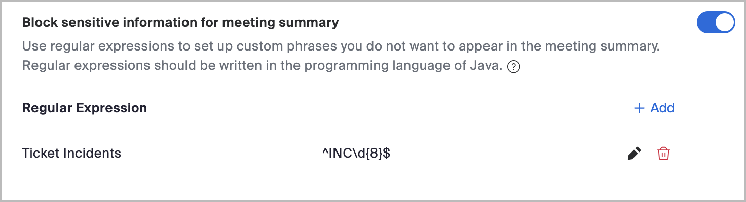 Account administrators can help prevent sensitive information from appearing in meeting summaries by configuring custom regular expressions. These regular expressions must follow Java's regex syntax and conventions. By defining specific patterns, admins can precisely control and automatically block the inclusion of sensitive phrases, numbers, or any other data types within meeting summaries.
