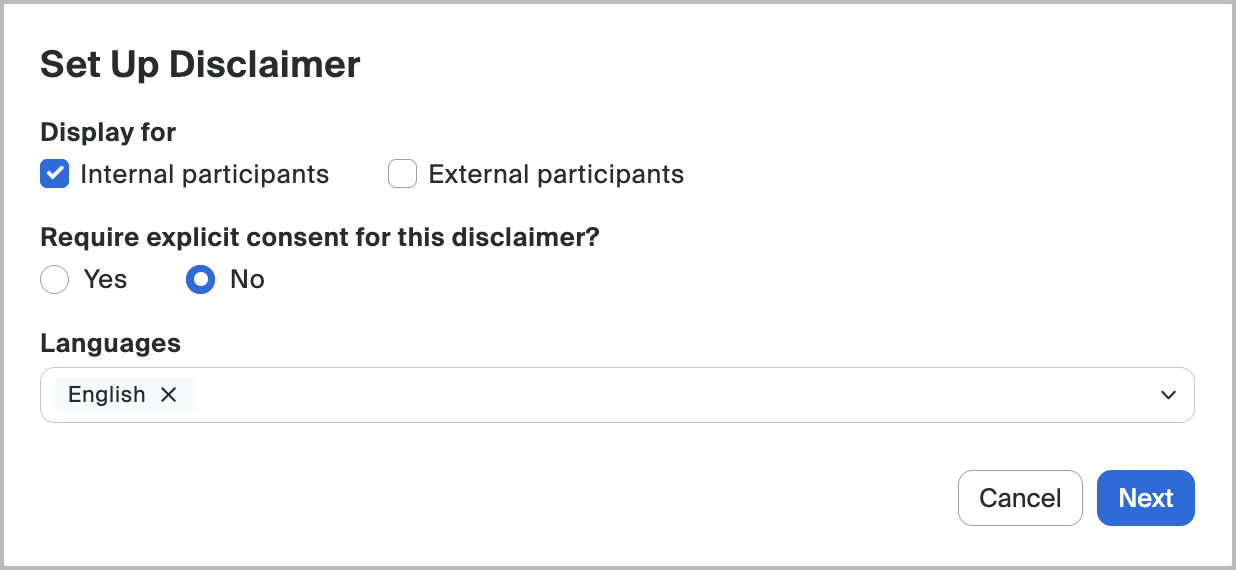 When creating the disclaimer(s), administrators must manually provide translated versions of the disclaimer messages for each desired language and audience (internal/external). The Zoom web portal does not provide an automated translation mechanism, so translations must be completed externally before being configured in the Custom Disclaimer’s settings.