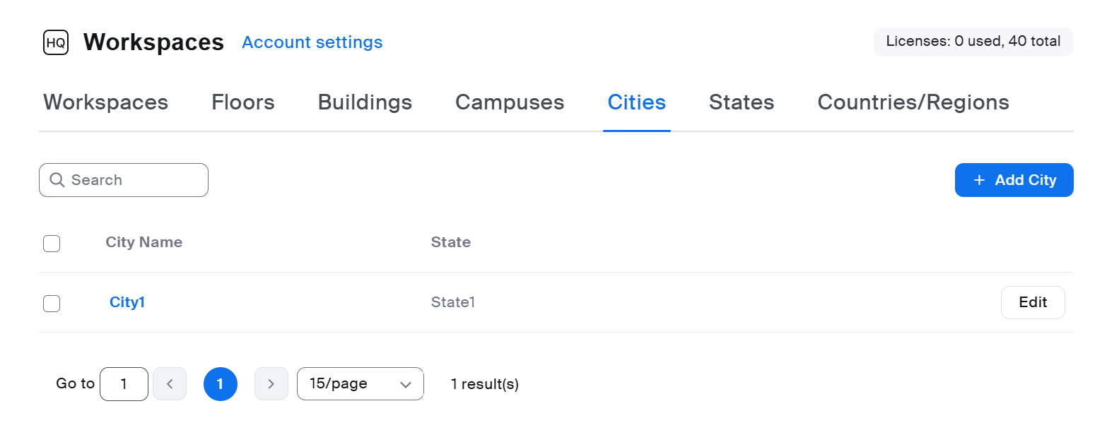 6. The **Workspaces**page will now display a directory pane, including a set of tabs for **Floors**, **Buildings**, **Campuses**, **Cities**, **States**, and **Countries/Regions**, depending on your configuration.